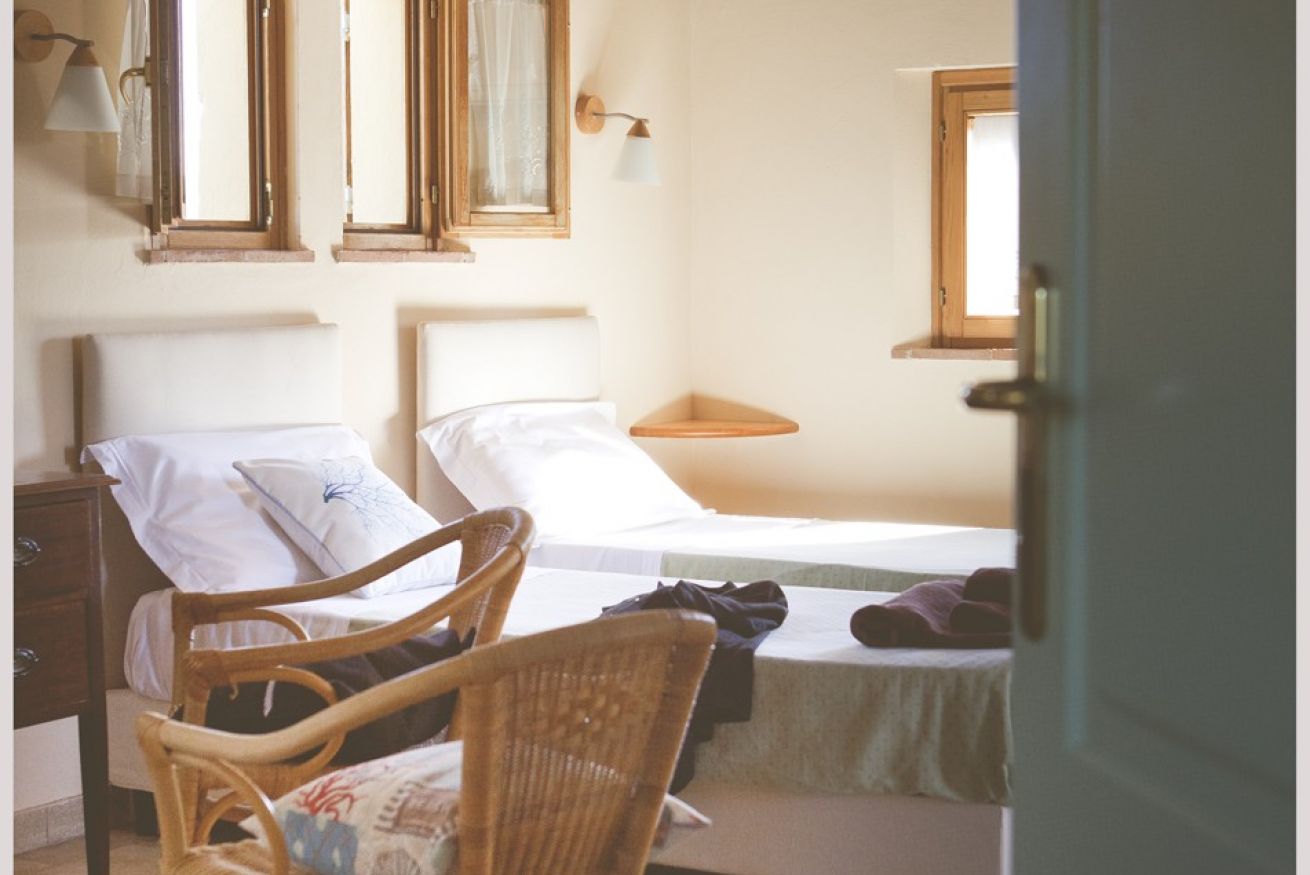 Piano primo: 2 camere matrimoniali con letto singolo, una con terrazza a tasca sul tetto con vista mare e colline, l’altra dotata di bagno con box doccia.