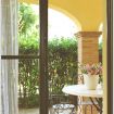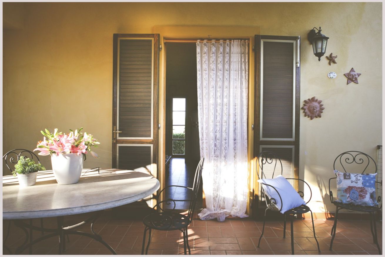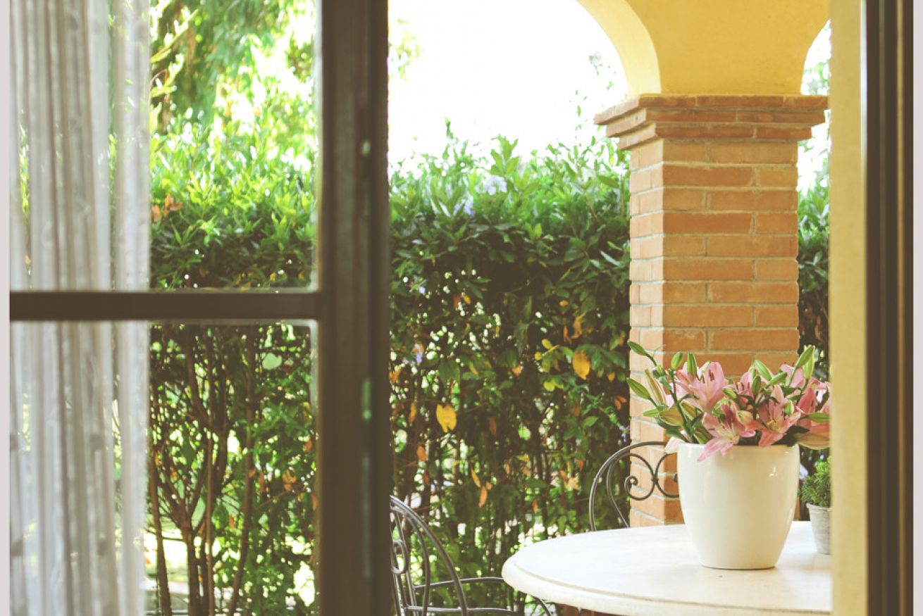 Vista dal porticato esterno: piscina, giardini dell’Agriturismo, mare.