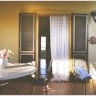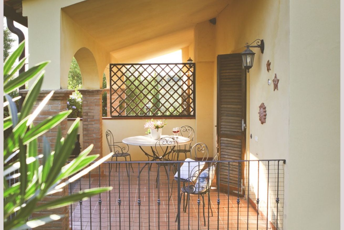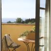 Vista dal piano primo: colline boscose, oliveto, mare.