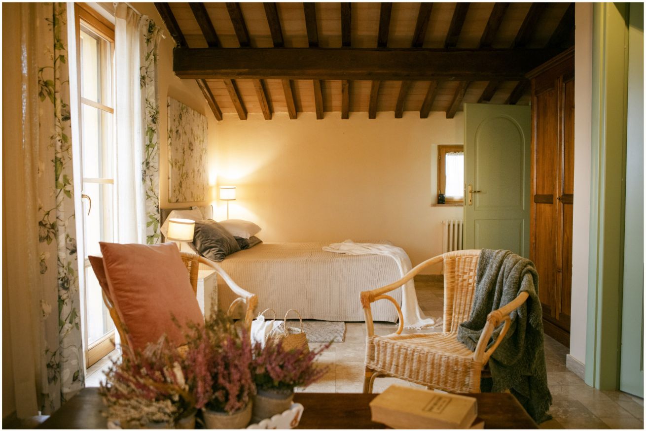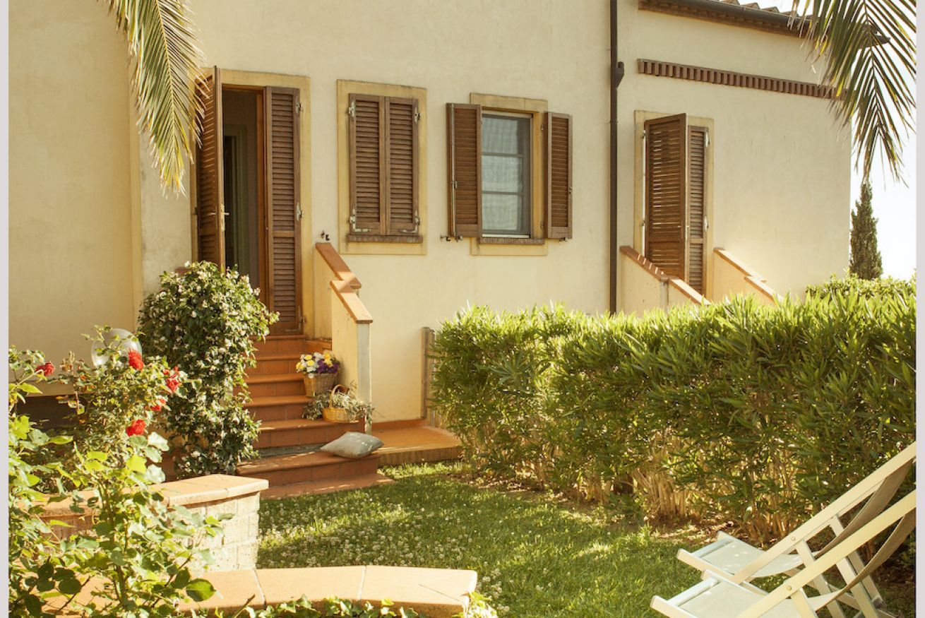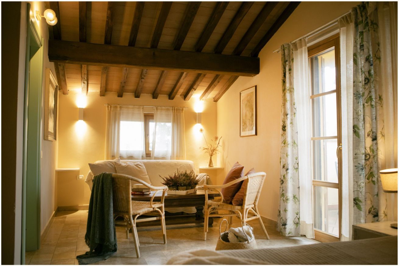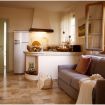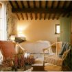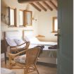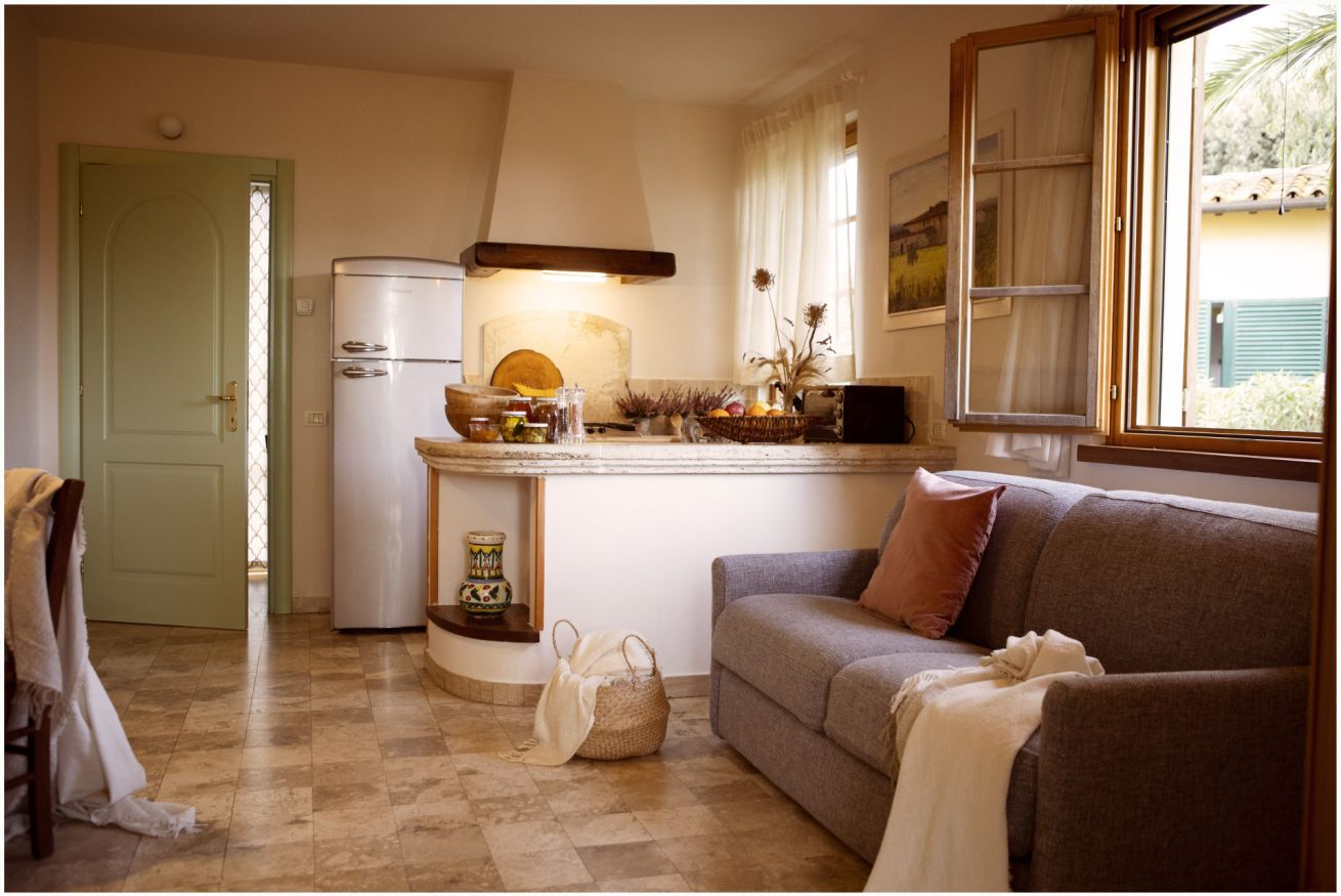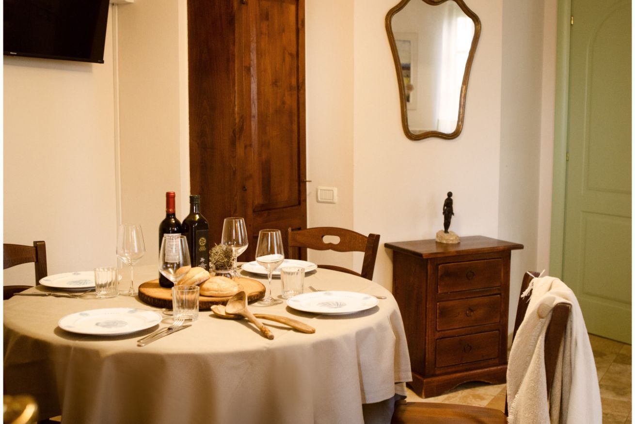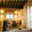 Piano terra: soggiorno con caminetto e divano letto matrimoniale, cucina in pietra in stile tipico toscano, bagno con box doccia.