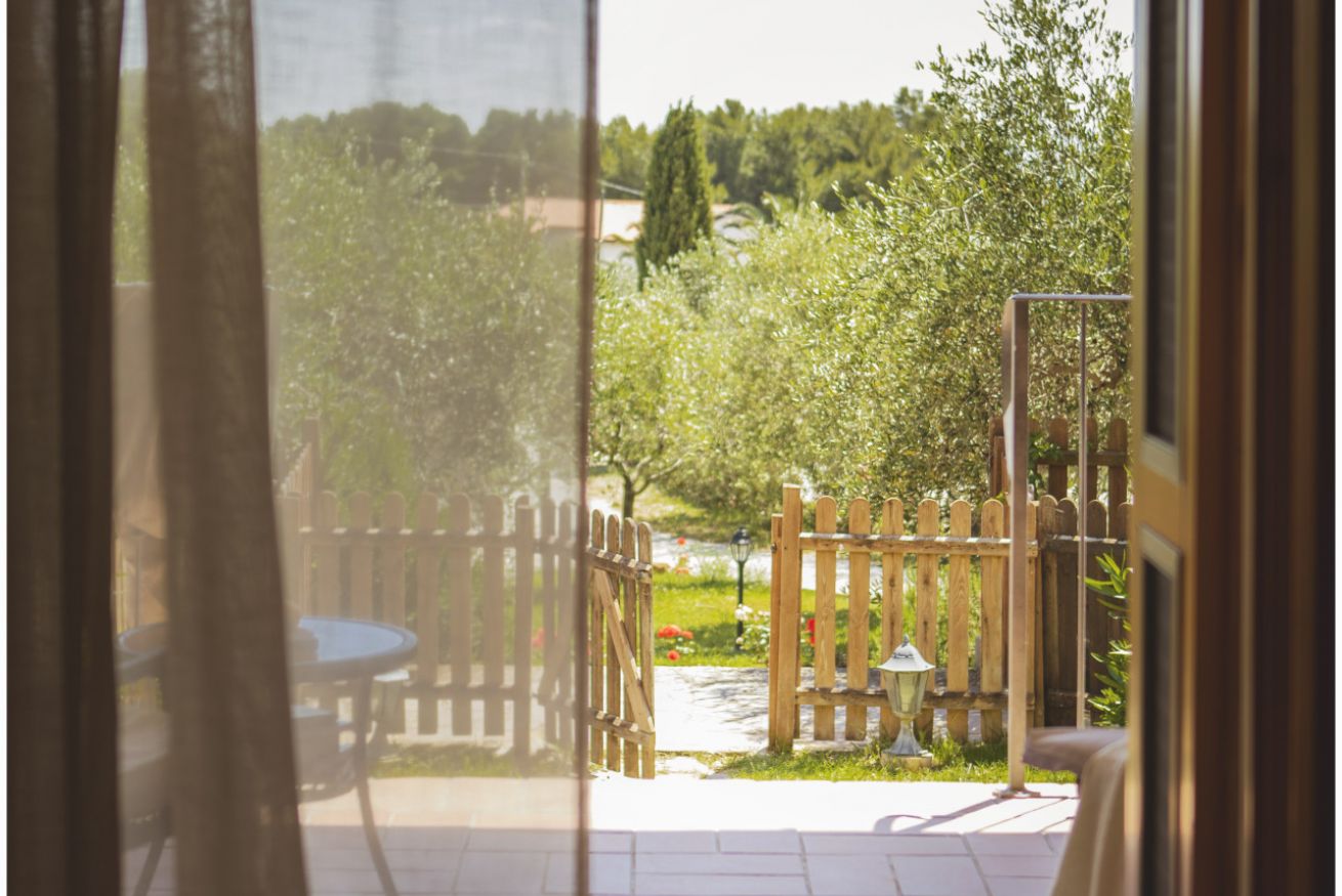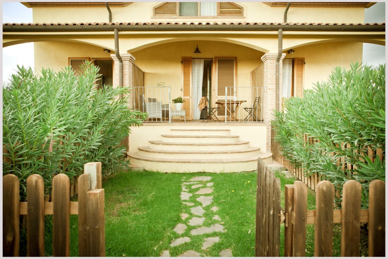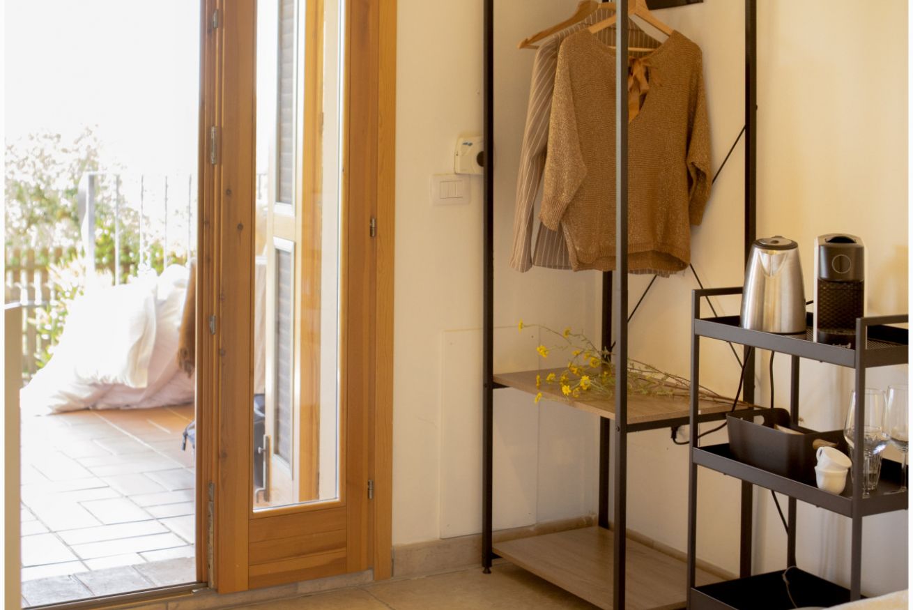 Bagno con box doccia. Porzione privata di portico con tavolino e divanetto. Giardinetto privato. Ingresso indipendente.
